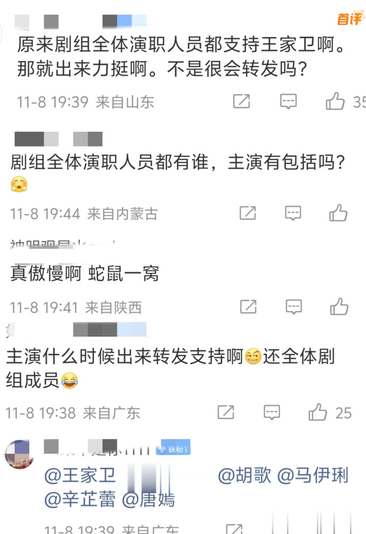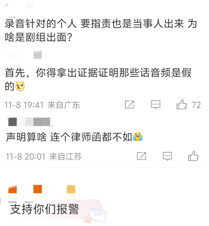 还有声明从头到尾漏洞百出,格式不对,落款连个公章也没有,明明出事的是王家卫、秦雯、李爽、彭绮华,剧组以什么立场代替他们回应,最后说的具体是哪个部门,影响那么大怎么不报警申请声纹鉴定,证明录音内容是假