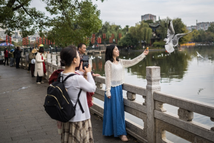 游客在昆明市翠湖公园内喂红嘴鸥。新华社记者王冠森摄